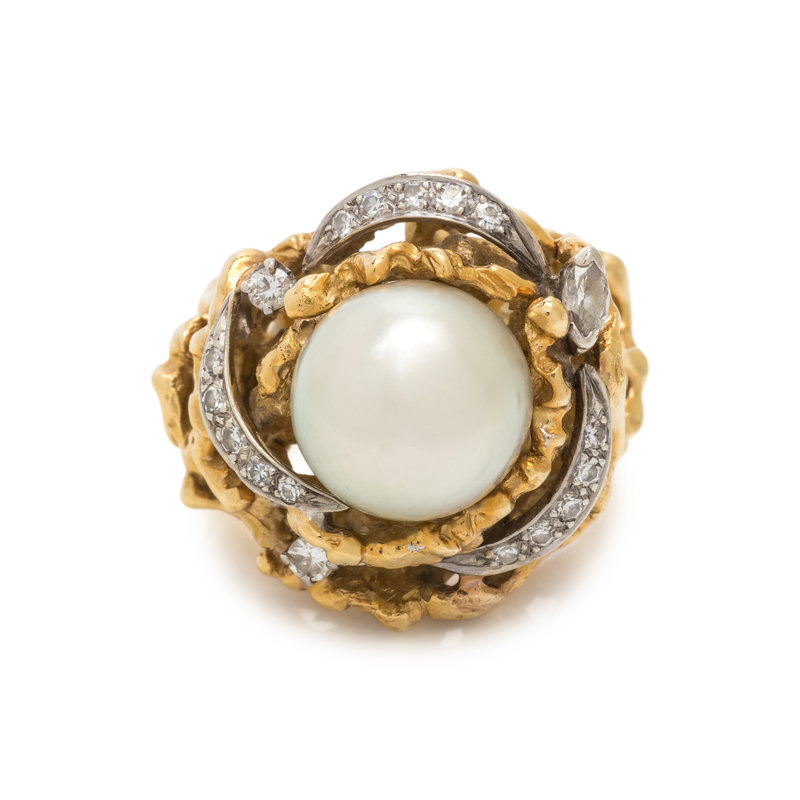 Containing one pearl measuring approximately 10.00 mm in diameter and 17 single cut and one marquise cut diamond. Ring size 5 3/4.
