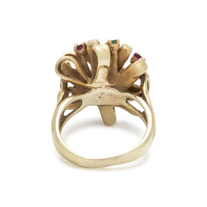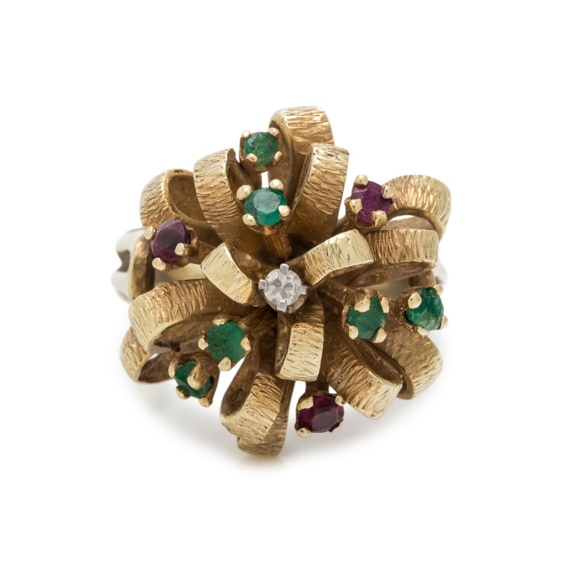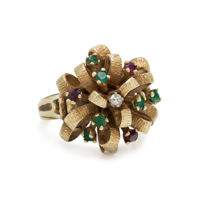 In a ribbon design, containing one single cut diamond, six round emeralds and three round red stones. Ring size 6 3/4.