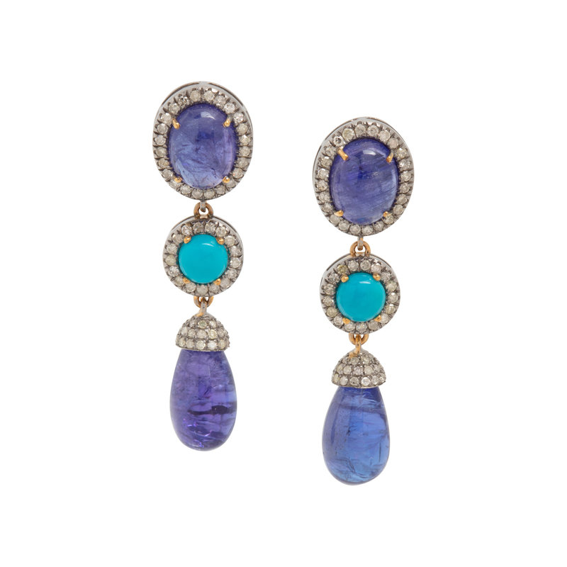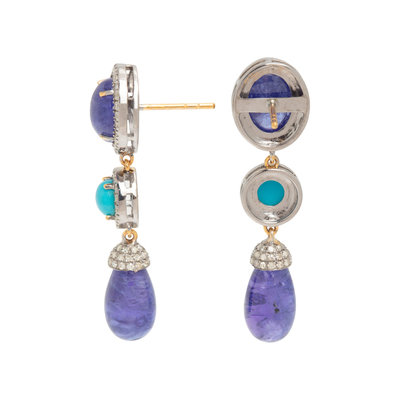 Containing two oval cabochon and two drop tanzanites, two round cabochon turquoise and numerous single cut diamonds. Mounted in silver. 1 1/2 inches long.