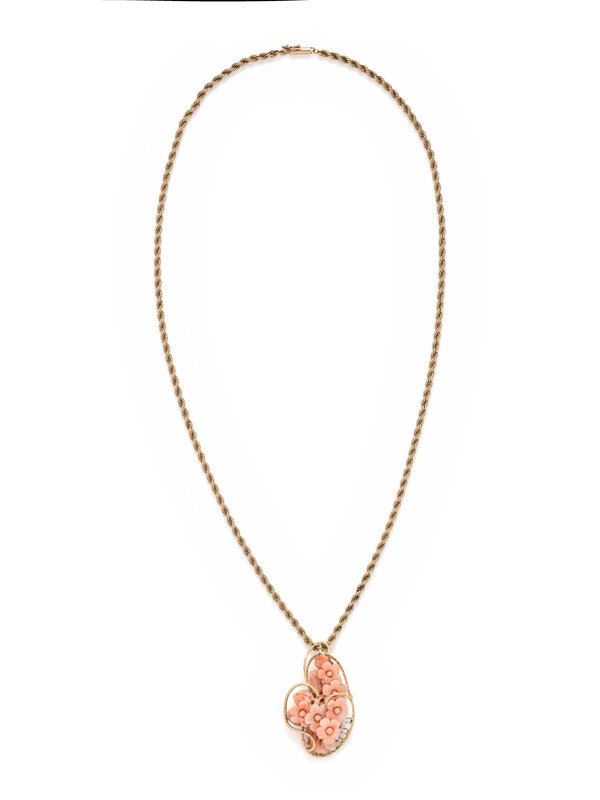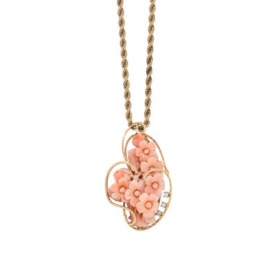 Consisting of a pendant containing one floral carved coral plaque and three round brilliant cut diamonds, suspended from a rope chain necklace. 24 1/2 inches long.