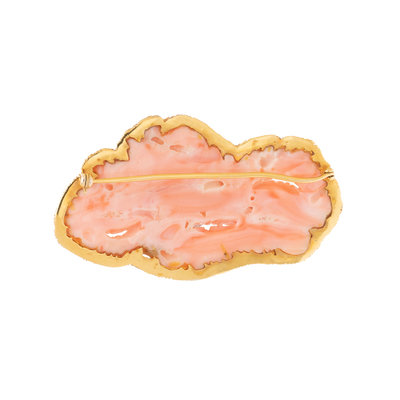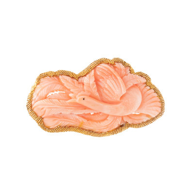 Containing one carved coral depicting a bird with leaves measuring approximately 34.00 x 64.00 mm. Mounted in yellow gold. 1 1/2 x 2 3/4 inches.