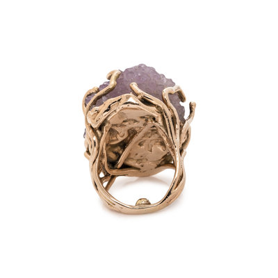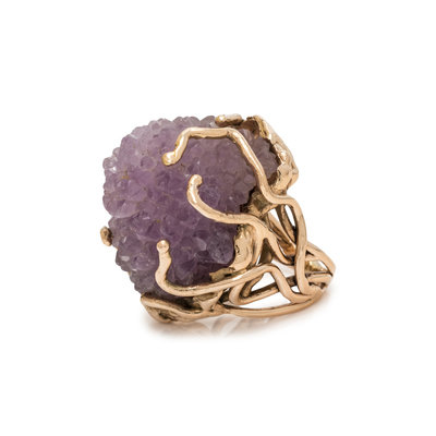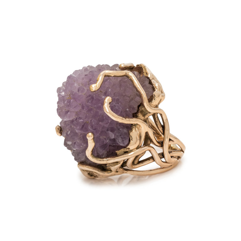In a Brutalist style, containing a rough amethyst crystal formation measuring approximately 25.00 x 20.00 mm. Ring size 6.
