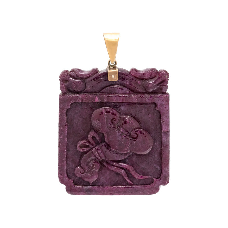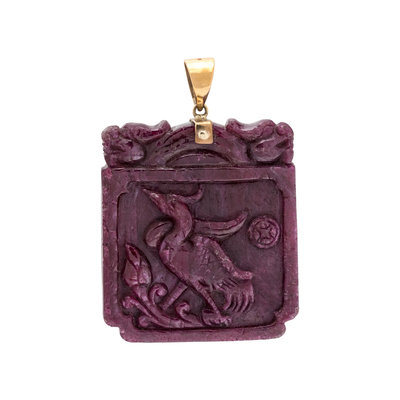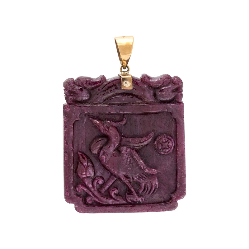 Consisting of a carved ruby plaque depicting a bird on one side and a flower on the reverse. Mounted in yellow gold. 2 1/2 inches long.