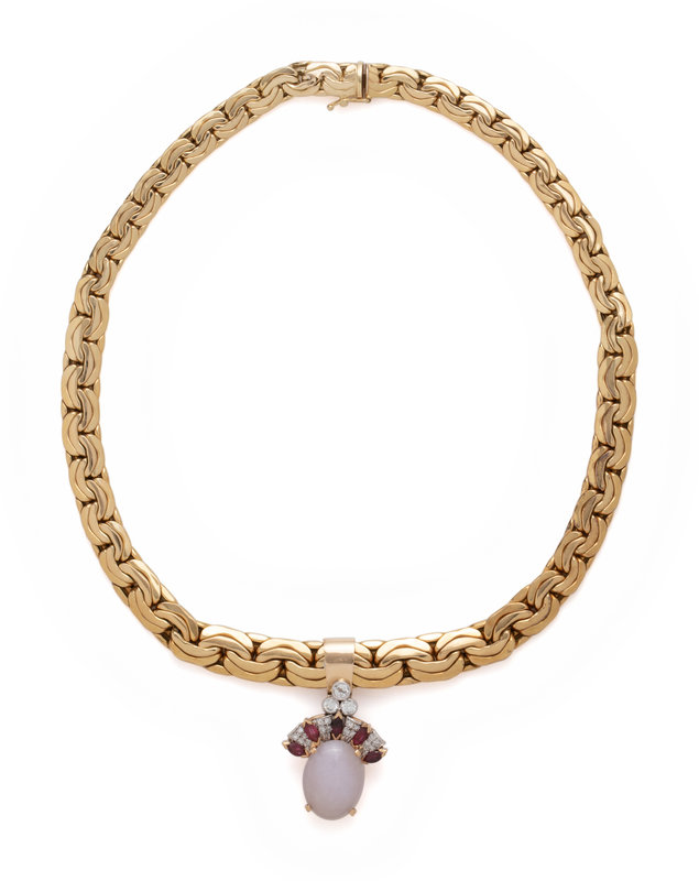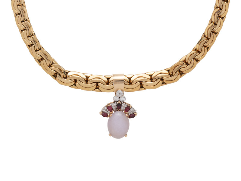 YELLOW GOLD, LAVENDER JADE, DIAMOND AND RUBY PENDANT/NECKLACE