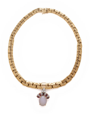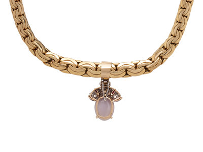 Consisting of a fancy link chain suspending a removable pendant containing one oval cabochon lavender jade measuring approximately 18.00 x 13.00 mm, 19 round brilliant and single cut diamonds and five marquise cut garnets. 16 inches long.
