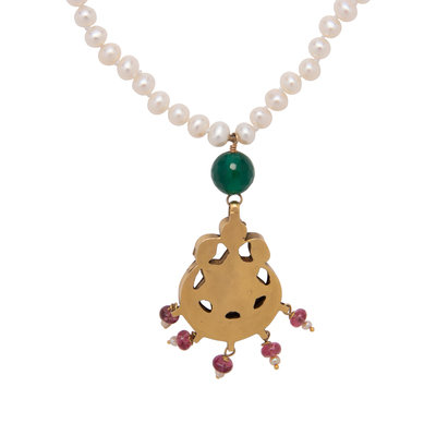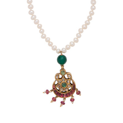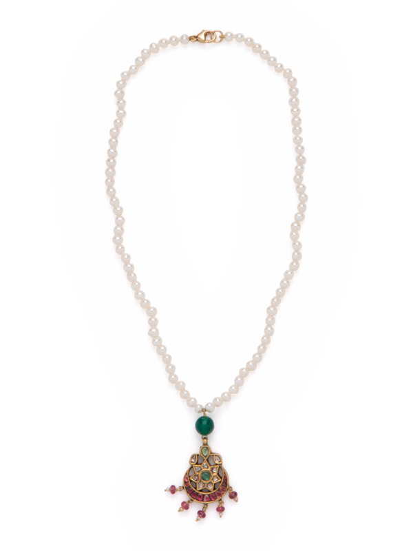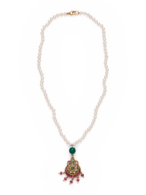 Consisting of a Mughal style pendant containing nine polki cut diamonds and numerous pink and green gemstones, suspended from a cultured pearl necklace. 16 inches long.