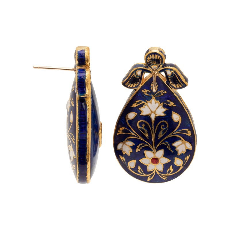 Consisting of a Mughul design with pear shaped lapis lazuli inlay surmounted with eight rose cut diamonds, the reverse with polychrome enamel foliate design. 1 1/2 inches long.
