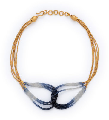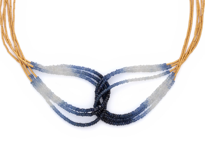 Consisting of interlocking strands of cylindrical gold beads and faceted sapphire beads in a graduated color design, with adjustable hook and eye clasp. 15-16 1/2 inches long.