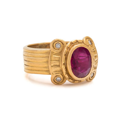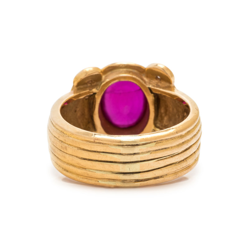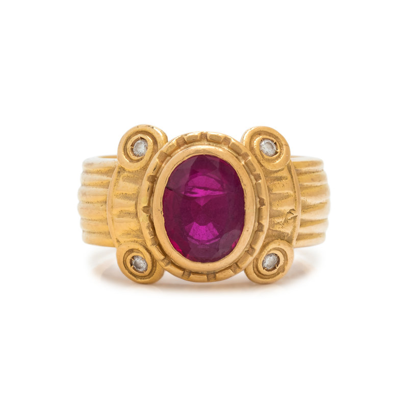 Designed as a pair of Ionic capitals, containing one oval mixed cut glass filled ruby and four round brilliant cut diamonds. Ring size 8 1/4.