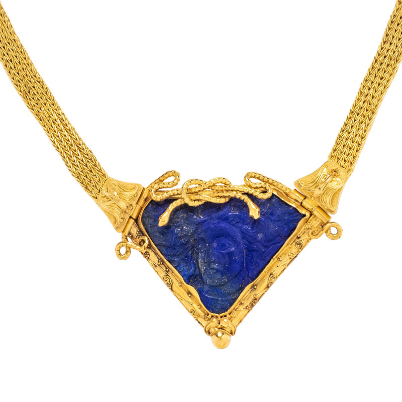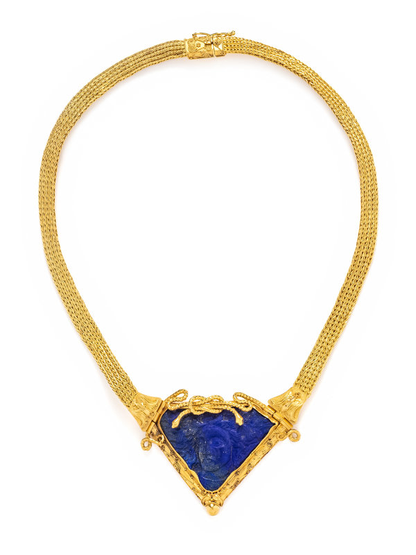 Containing one carved lapis lazuli plaque depicting a figure, with with granulated gold snake motif surround and suspended from a quadruple wheat chain. 16 1/2 inches long.