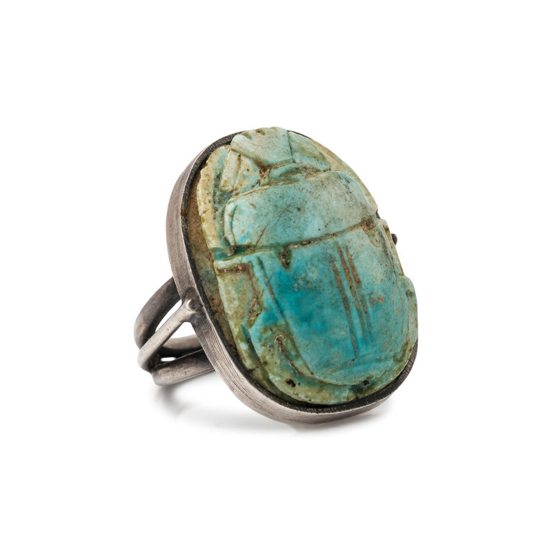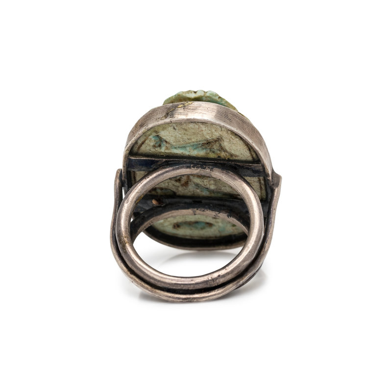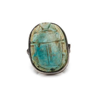 Containing one ancient faience scarab measuring approximately 25.00 x 18.00 mm. Ring size 5 1/4.