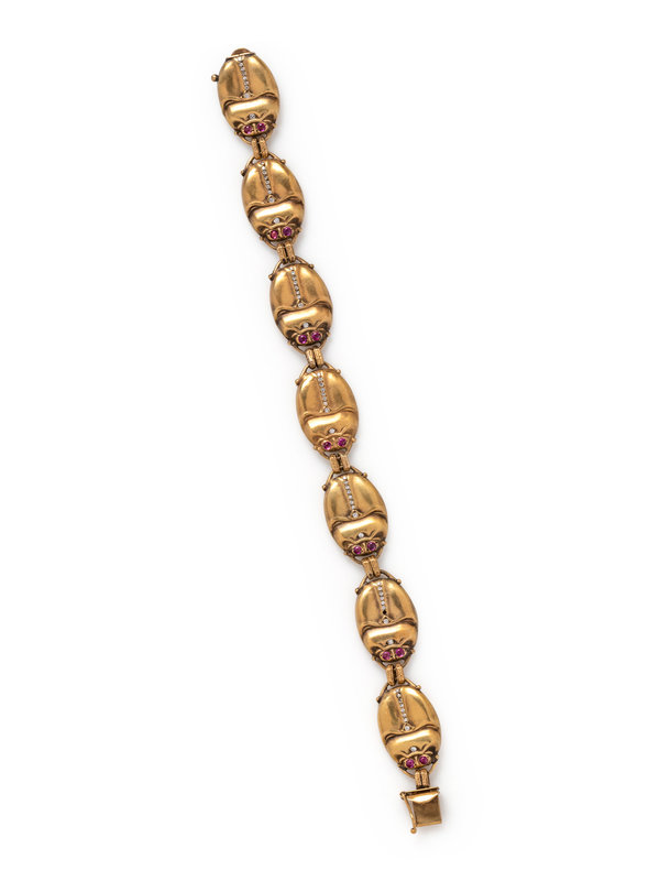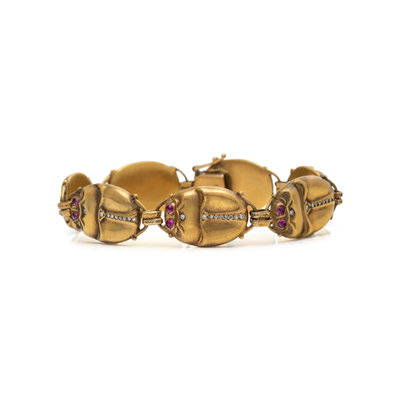 YELLOW GOLD, DIAMOND AND RUBY SCARAB BRACELET
