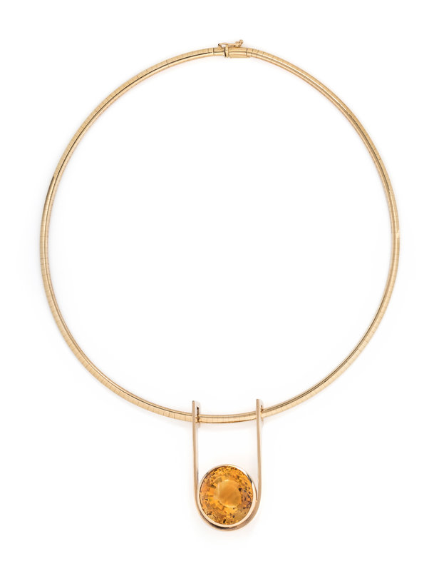 Consisting of a pendant containing one oval mixed cut citrine measuring approximately 21.00 x 19.50 x 16.00 mm, suspended from an omega link chain measuring approximately 3.00 mm wide. 16 inches inner circumference.