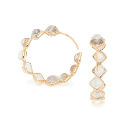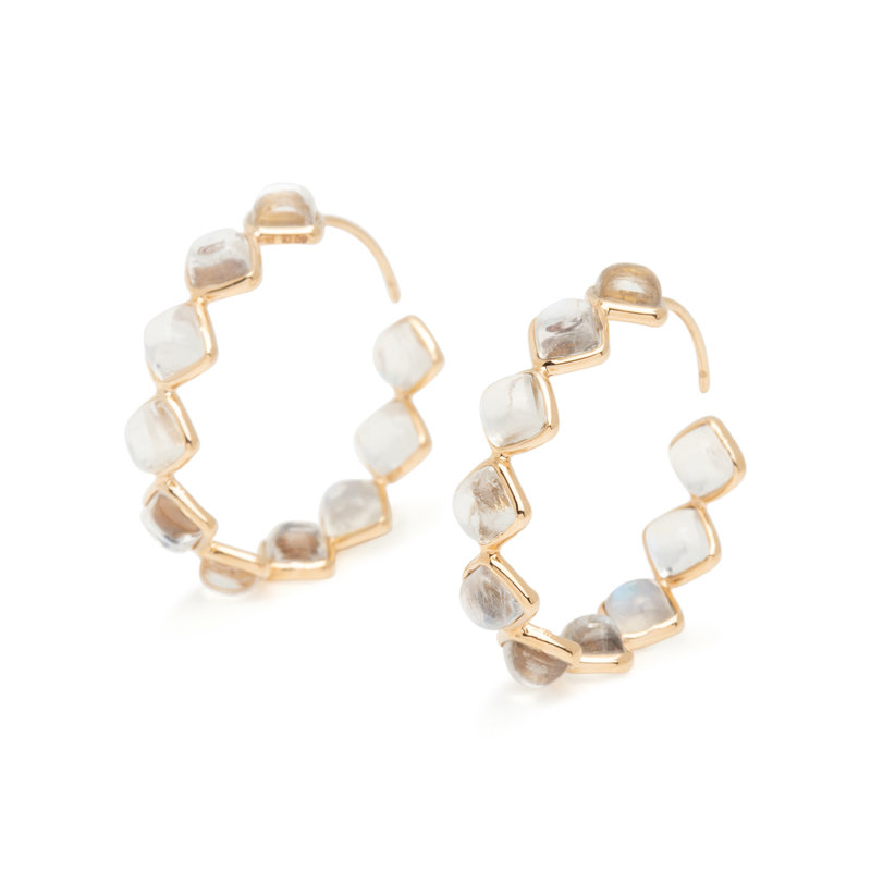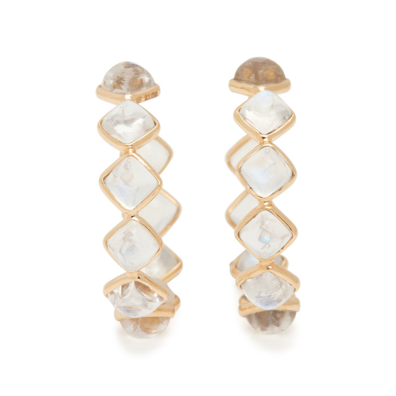 In an inside out style, containing 20 sugarloaf moonstones. Mounted in rose gold. 1 inch long.