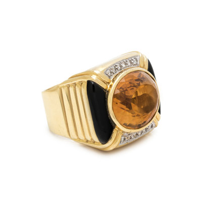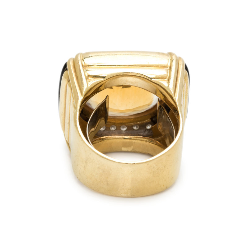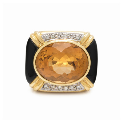 Containing one oval mixed cut citrine measuring approximately 17.00 x 14.00 x 10.20 mm, 12 round brilliant cut diamonds weighing approximately 0.20 carat total and two onyx plaques. Mounted in yellow gold. Ring size 5 1/2.