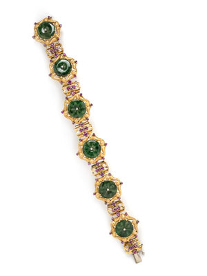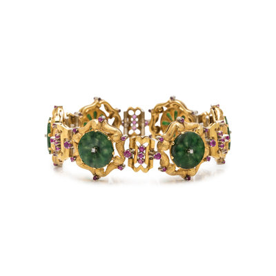 YELLOW GOLD, JADE, RUBY AND DIAMOND BRACELET