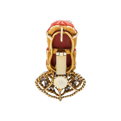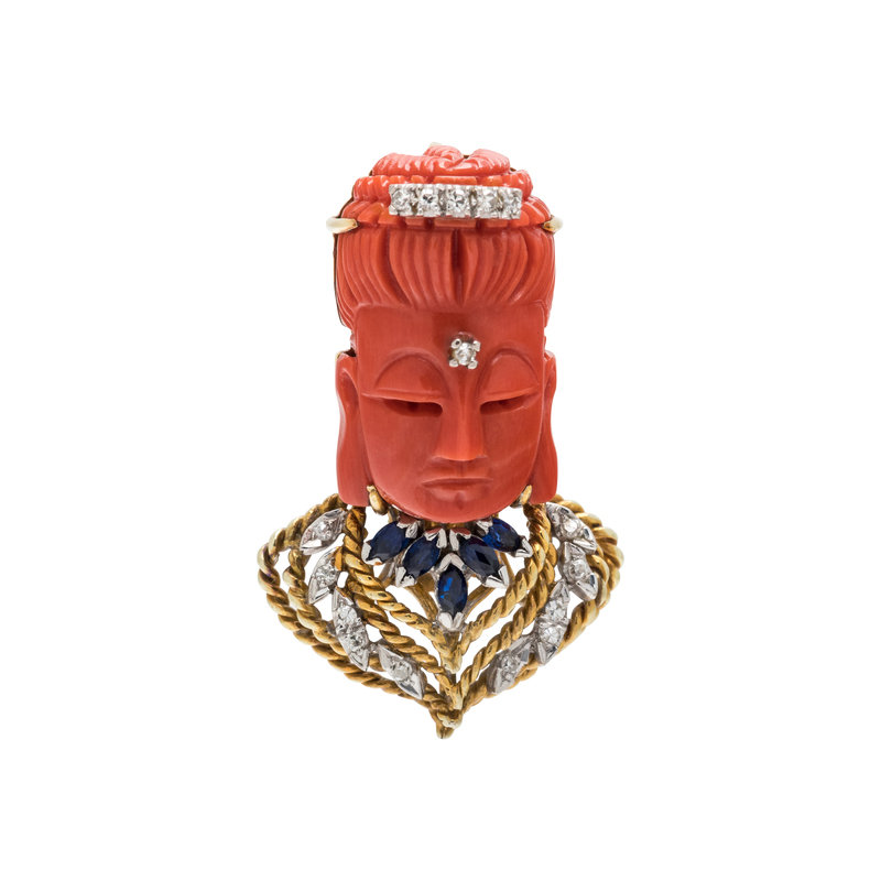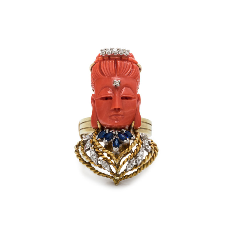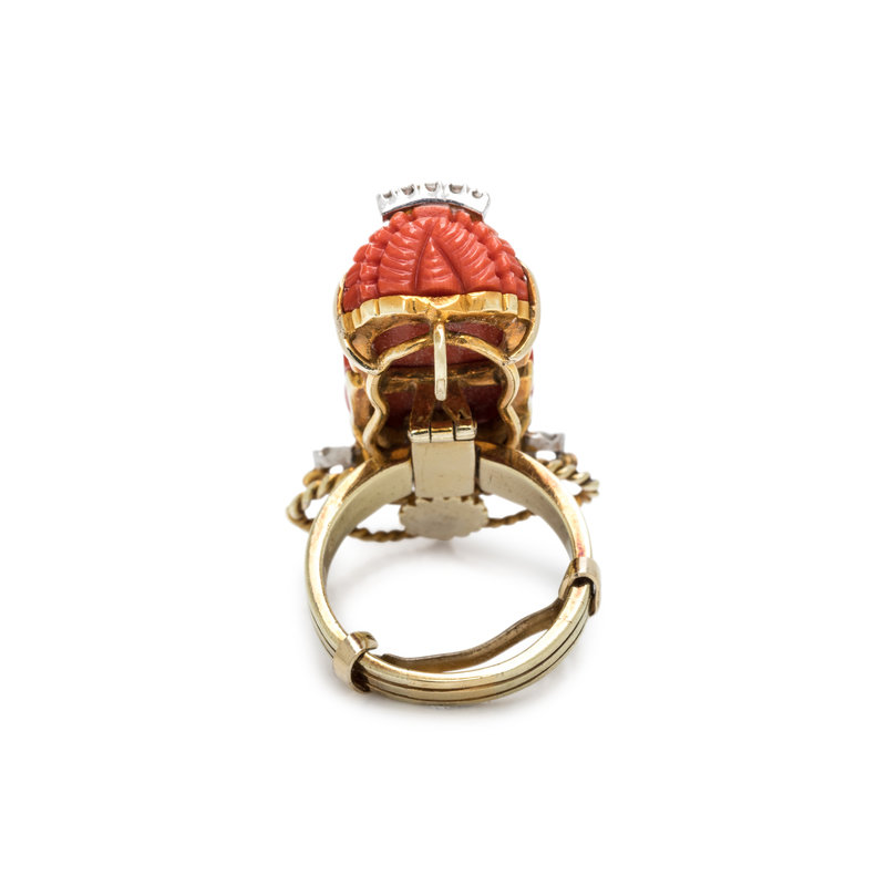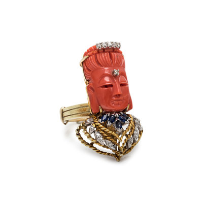 Containing one carved coral head, five marquise cut sapphires and 16 single cut diamonds, with hinged back allowing the ring to be removed and worn as a pendant. Mounted in yellow gold. Ring size 8 3/4. Pendant: 1 1/2 inches long.