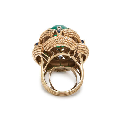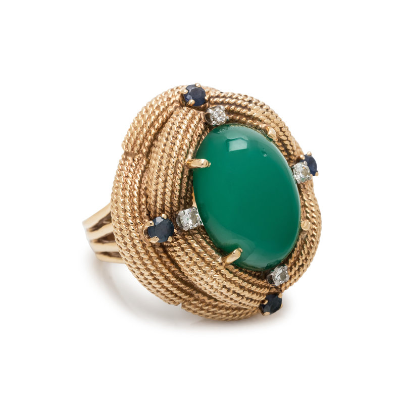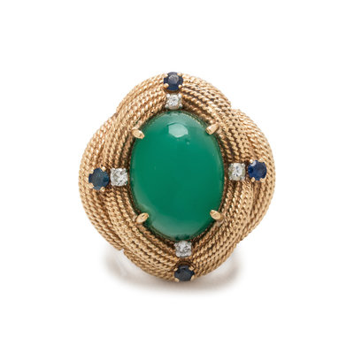 YELLOW GOLD, GREEN AGATE, SAPPHIRE AND DIAMOND RING