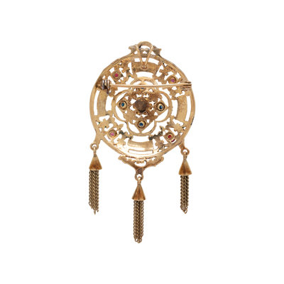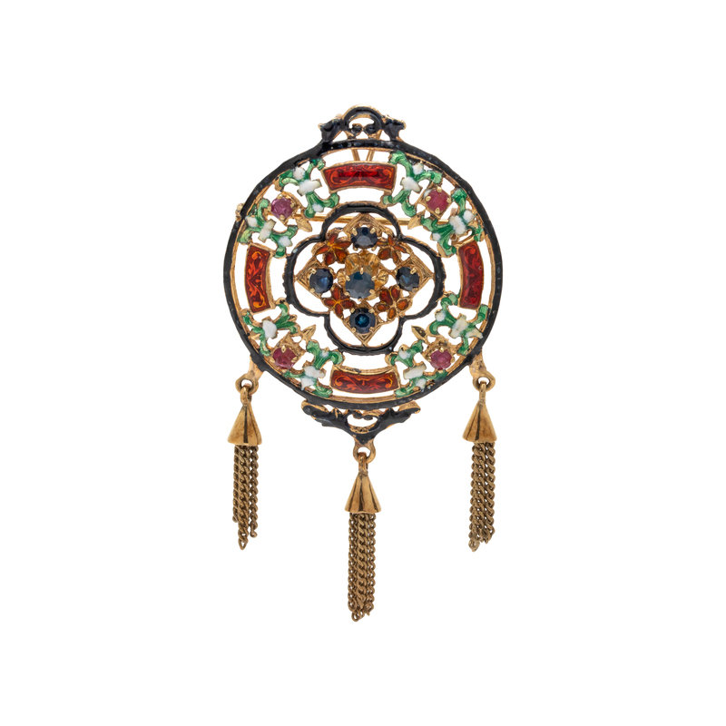 Containing five round mixed cut sapphires, four round mixed rubies and polychrome enamel decoration. Mounted in yellow gold. 2 3/4 x 1 1/2 inches.