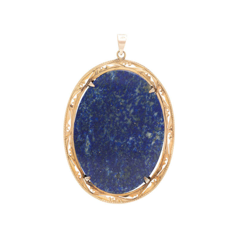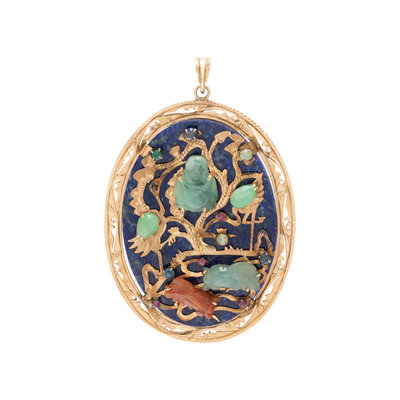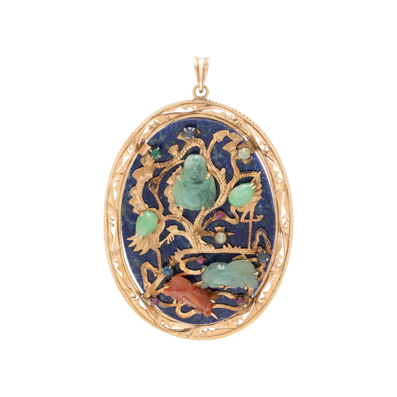 Consisting of a pierced yellow gold surround containing one oval lapis lazuli plaque, overlaid with a yellow gold design containing carved and cabochon gemstones including jadeite, emerald and ruby. 2 7/8 inches long.