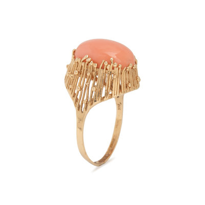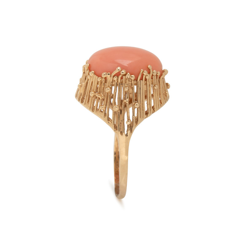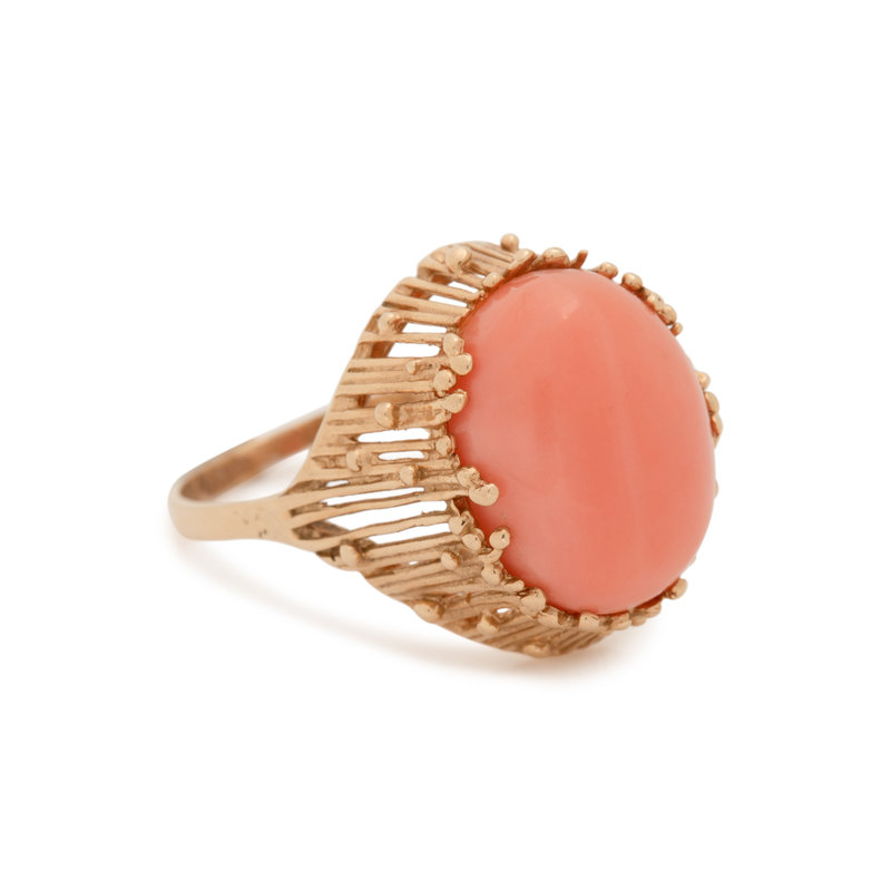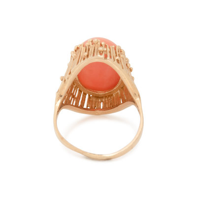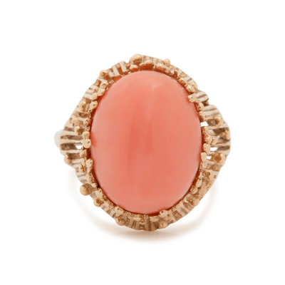 Containing one oval cabochon coral measuring approximately 15.00 x 12.00 mm. Ring size 8 1/2.