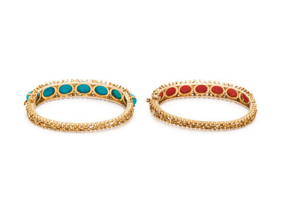Consisting of a bangle containing seven oval cabochon turquoise and 12 round brilliant cut diamonds weighing approximately 0.35 carat total, together with a bangle containing seven oval cabochon coral simulants and 12 round brilliant cut diamonds weighing approximately 0.35 carat total, hinged with side clasps. 6 1/4 inches inner circumference.