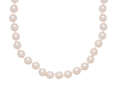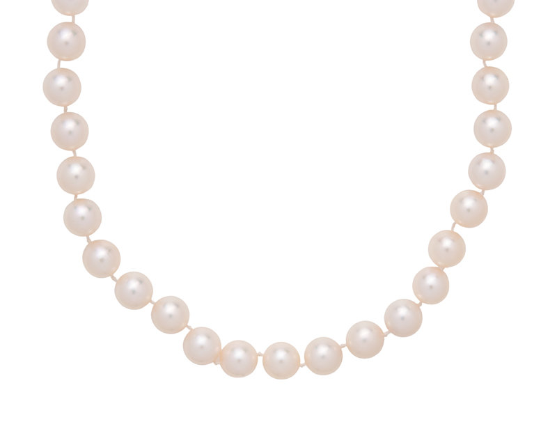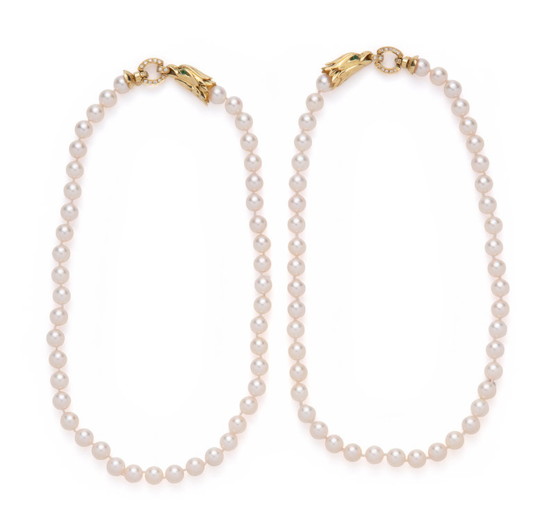 Consisting of a necklace with pearls measuring approximately 9.00 mm in diameter, strung knotted with a yellow gold eagle head clasp containing one emerald eye and 12 round brilliant cut diamonds weighing approximately 0.20 carat total, together with a matching necklace. 20 1/2 inches long each.