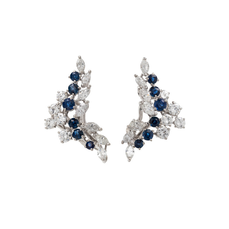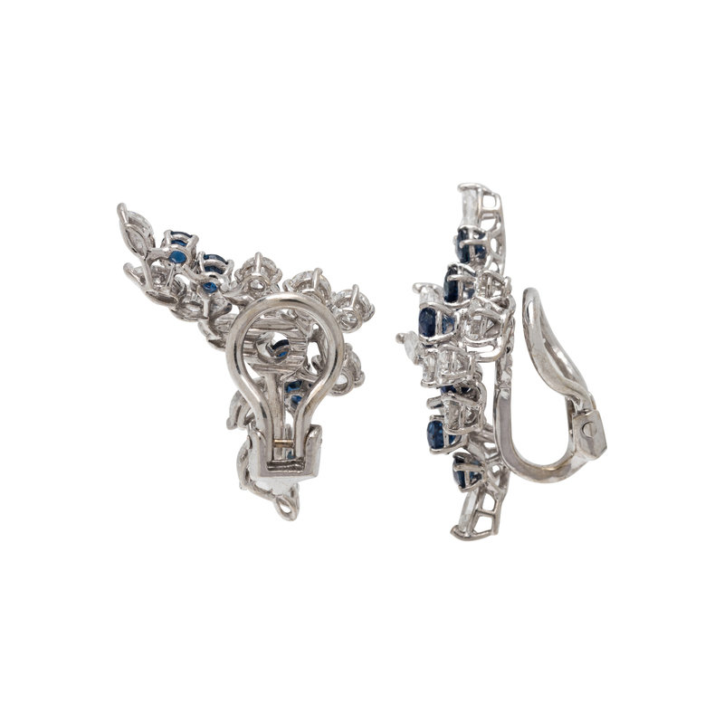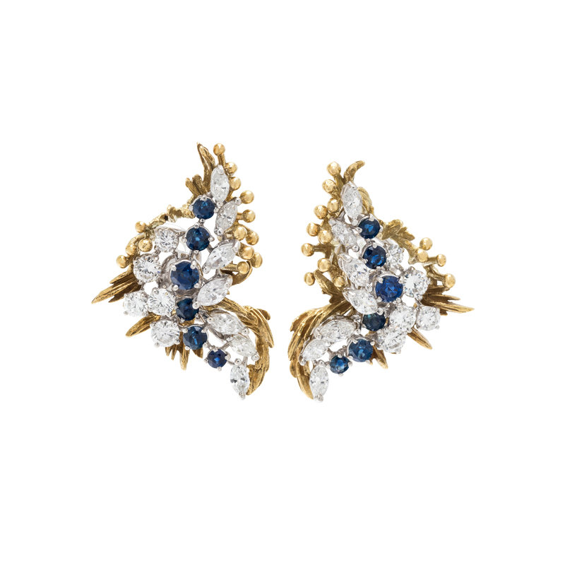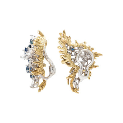 Consisting of platinum earclips containing 10 round brilliant cut diamonds weighing approximately 1.10 carats total, seven marquise cut diamonds weighing approximately 1.40 carats total and 12 round mixed cut sapphires, together with textured yellow gold jackets. 1 3/8 inches long.