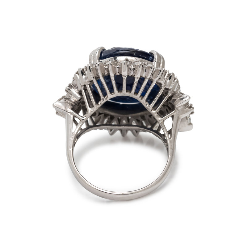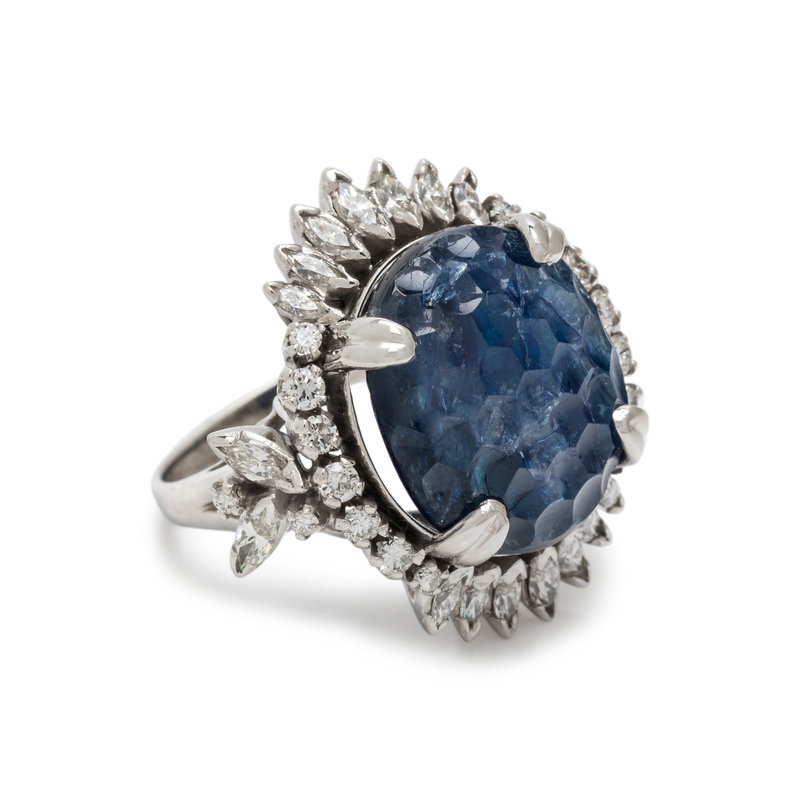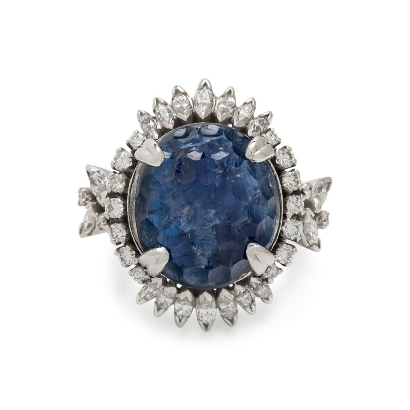 Containing one oval carved sapphire measuring approximately 16.40 x 13.90 mm, 18 marquise and 18 round brilliant cut diamonds weighing approximately 2.45 carats total. Mounted in platinum. Ring size 6 1/2.