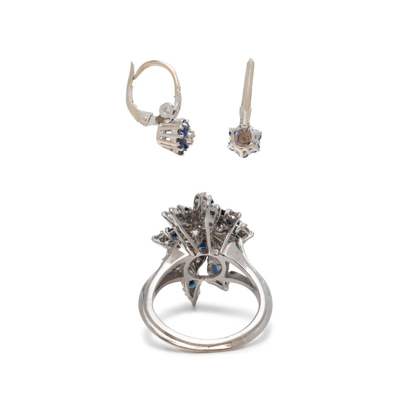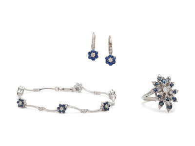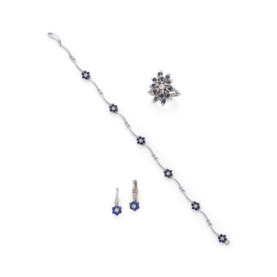 Consisting of a ring containing 25 round brilliant and old European cut diamonds weighing approximately 0.65 carat total and 12 round mixed cut sapphires, a bracelet containing 12 round brilliant cut diamonds and 36 round mixed cut sapphires, together with a pair of earrings containing 12 round brilliant cut diamonds and 12 round mixed cut sapphires. Mounted in white gold. Ring size 6 3/4. Bracelet: 7 inches long. Earrings: 3/4 inch long.