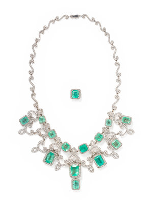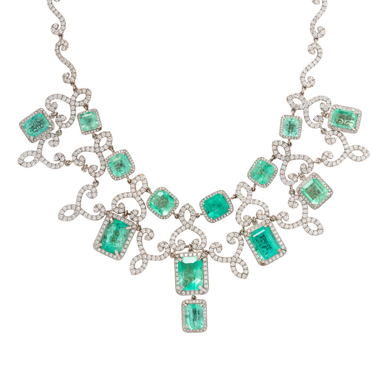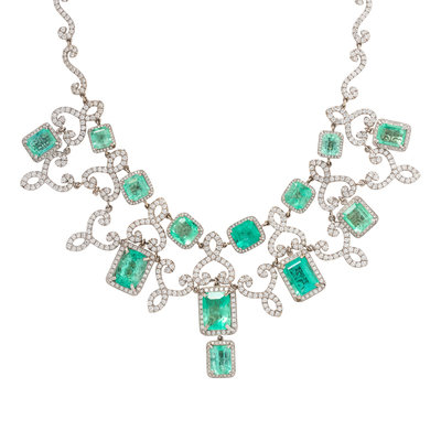 Containing 14 emerald and cushion cut emeralds weighing approximately 40.00 carats total and numerous round brilliant cut diamonds weighing approximately 5.00 carats total. Mounted in white gold. 16 3/4 inches long.
