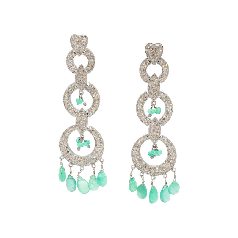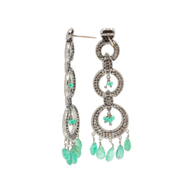 Containing numerous single cut diamonds and colored diamonds (origin of color not tested), 10 emerald briolettes and nine faceted emerald beads. Mounted in blackened gold. 2 5/8 inches long.