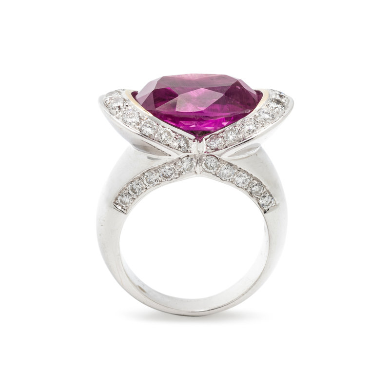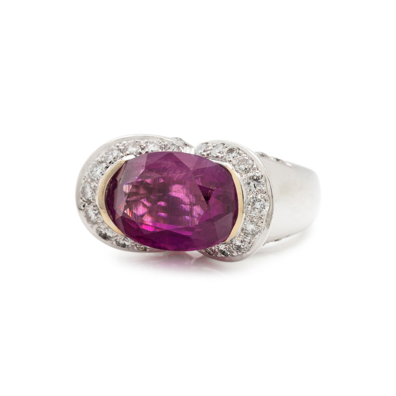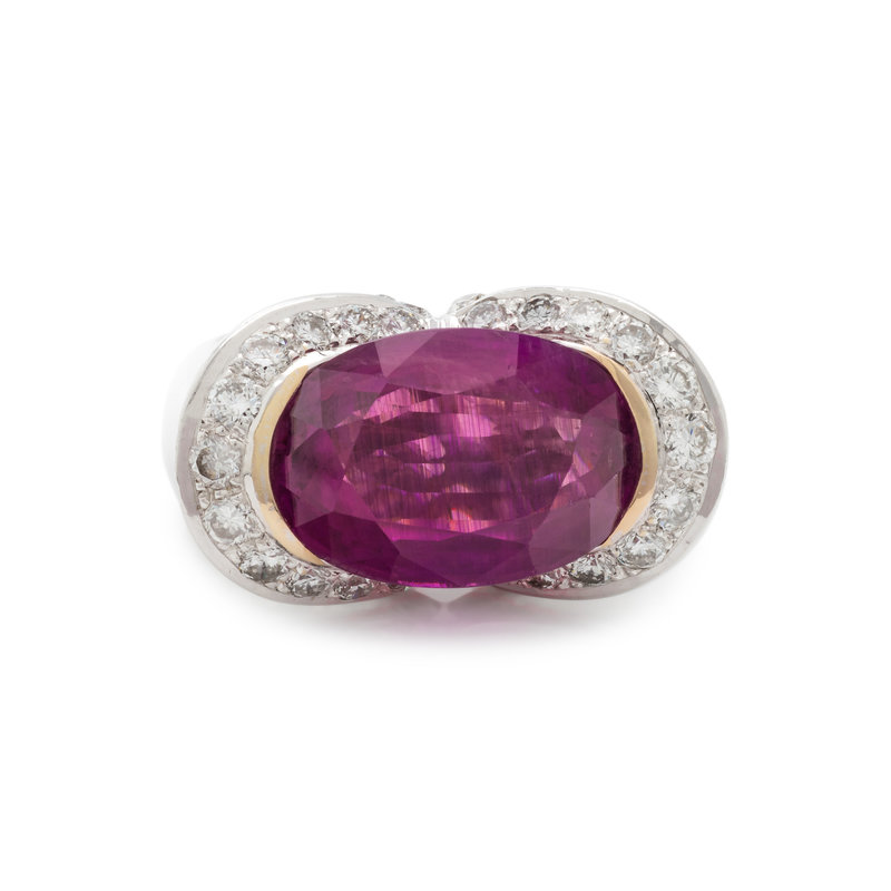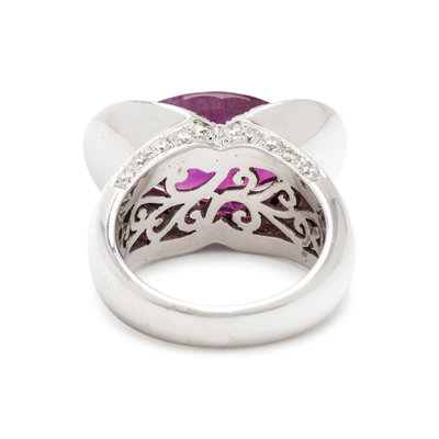 Containing one oval mixed cut ruby measuring approximately 15.85 x 11.20 mm and 42 round brilliant cut diamonds weighing approximately 1.45 carats total. Mounted in white gold. Ring size 7 1/2.