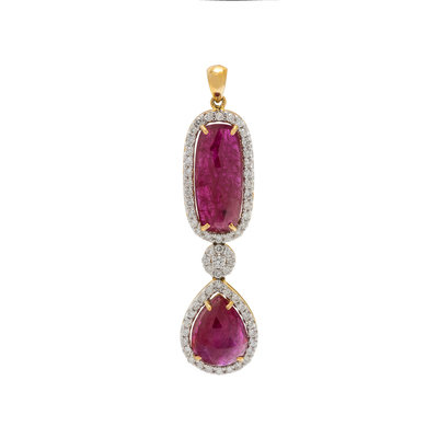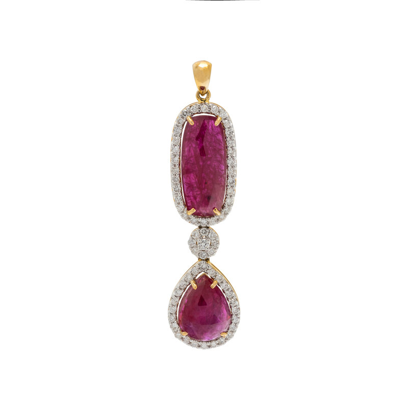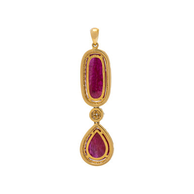 Containing one elongated cushion and one pear rose cut ruby and 63 round brilliant cut diamonds weighing approximately 0.95 carat total. Mounted in yellow gold. 2 inches long.