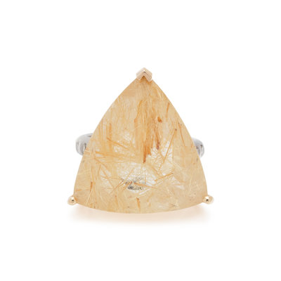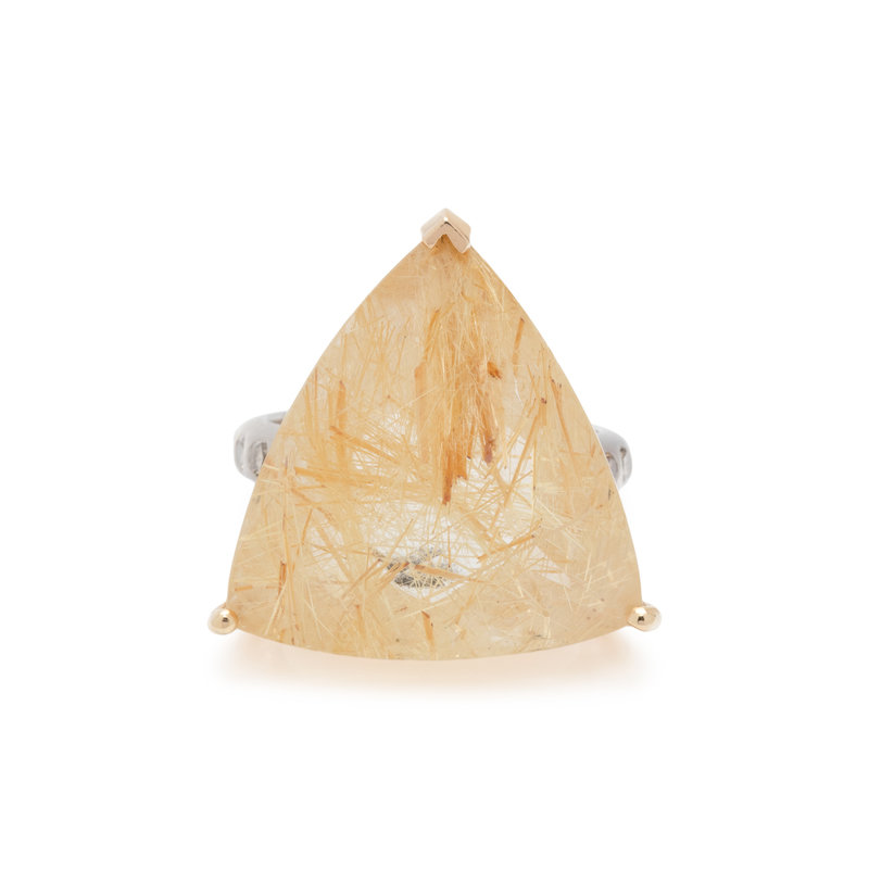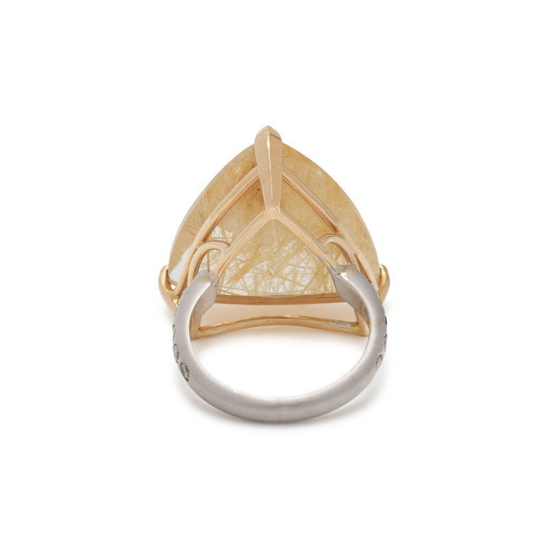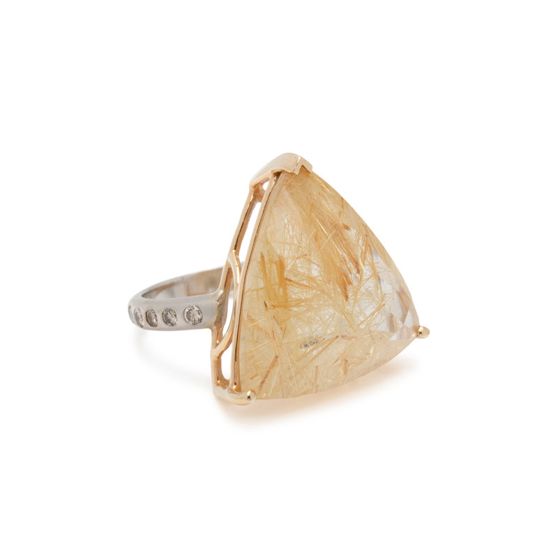 Containing one triangular mixed cut rutilated quartz measuring approximately 20.75 x 20.00 x 10.25 mm and 10 round brilliant cut diamonds weighing approximately 0.25 carat total. Mounted in bicolor gold. Ring size 6.
