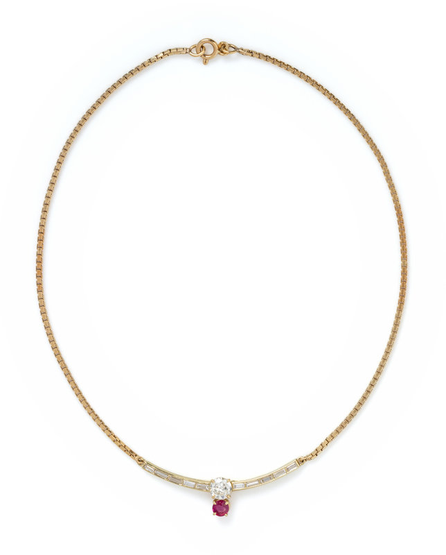 Containing one old European cut diamond weighing approximately 0.95 carat, one synthetic ruby and 10 baguette cut diamonds weighing approximately 1.30 carats total, suspended from a box chain. 15 1/2 inches long.