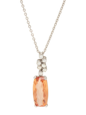Containing one elongated cushion mixed cut topaz measuring approximately 17.30 x 8.75 x 6.20 mm and seven round brilliant cut diamonds weighing approximately 0.20 carat total, suspended from a cable link chain. Mounted in platinum with white gold chain. 15 1/2 inches long.