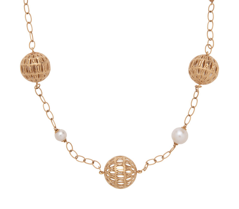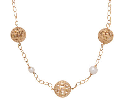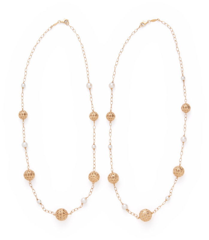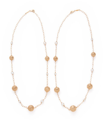 Consisting of two necklaces with twisted cable link chain interspersed with open wirework beads and pearl beads. 28 inches long.
