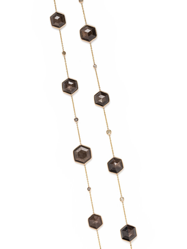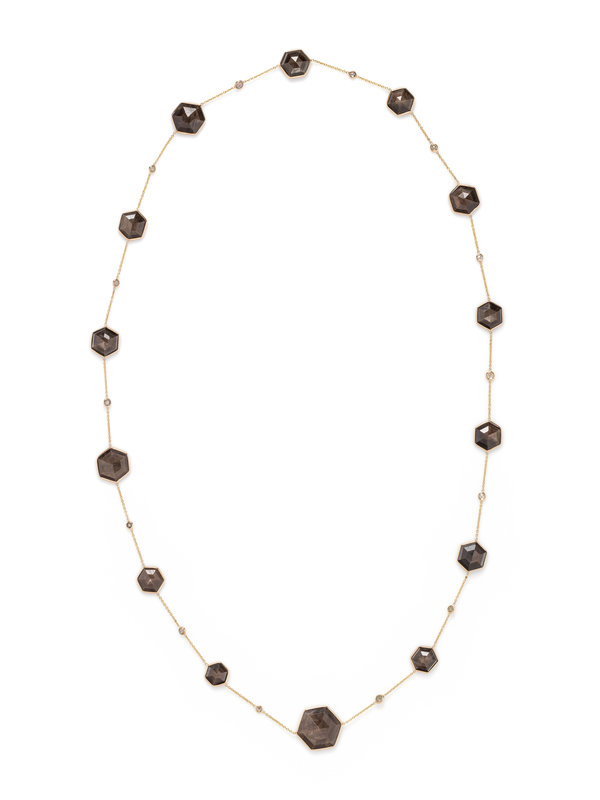 Consisting of a cable link chain interspersed with 14 hexagonal step cut grey sapphires and 14 round brilliant cut colored diamonds (origin of color not tested). 27 inches long.