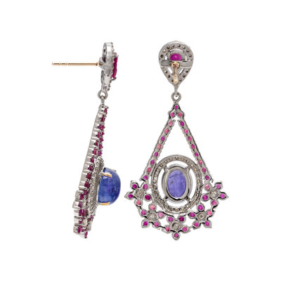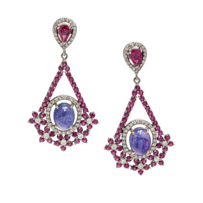 Containing two oval cabochon tanzanites, two pear shaped and numerous round mixed cut rubies and numerous single cut diamonds. Mounted in silver with yellow gold posts. 1 3/4 inches long.