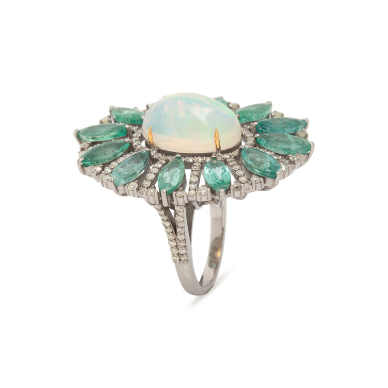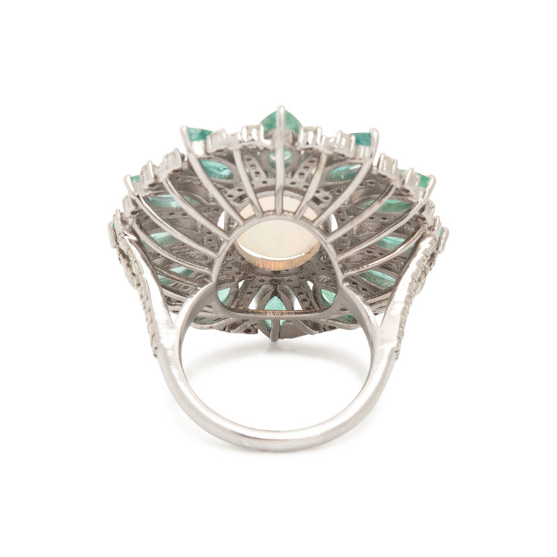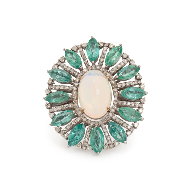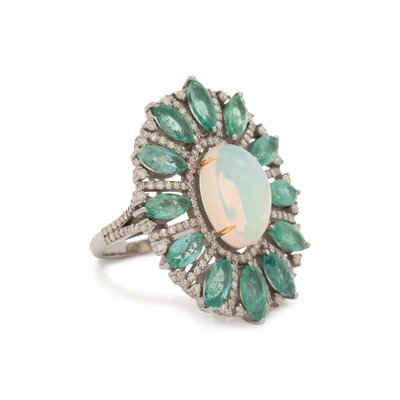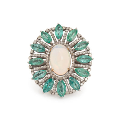 Containing one oval cabochon opal, 12 marquise cut emeralds and numerous single cut diamonds. Mounted in silver. Ring size 6 1/2.