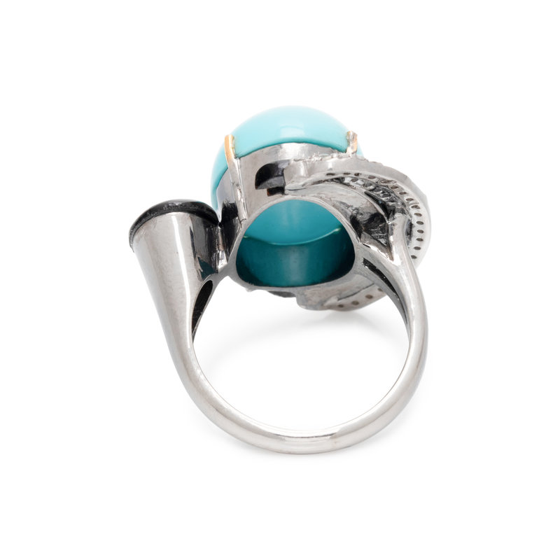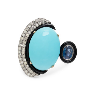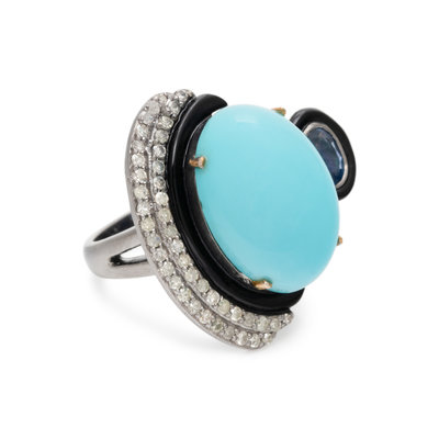 Containing one oval cabochon synthetic turquoise, one oval mixed cut sapphire and numerous single cut diamonds. Mounted in silver. Ring size 6 1/2.