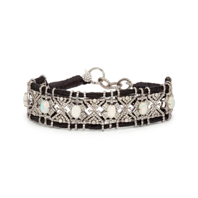 Consisting of silver links containing six oval cabochon opals and numerous single cut diamonds strung on a black cord. 7 1/4-8 inches long.