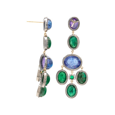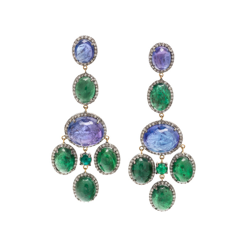 Containing eight oval and two round cabochon emeralds, four oval cabochon tanzanites and numerous single cut diamonds. Mounted in silver. 2 1/8 inches long.
