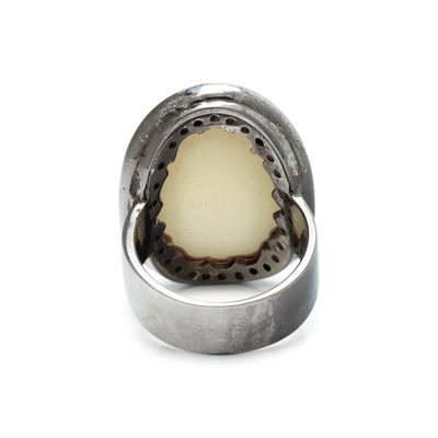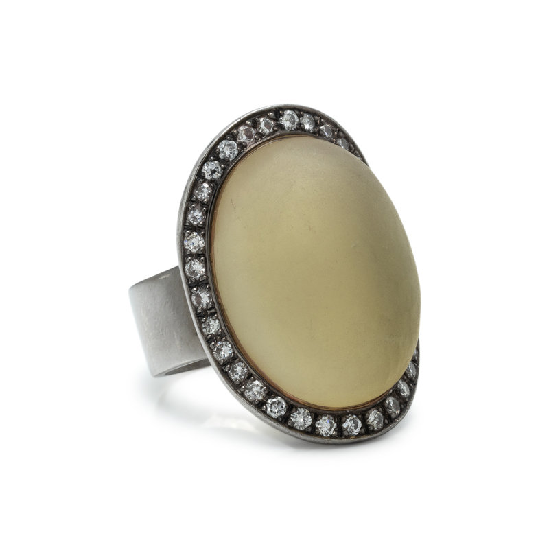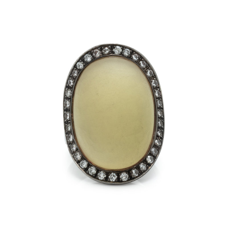 Containing one oval cabochon frosted light yellow quartz measuring approximately 22.55 x 16.20 x 9.00 mm and 34 round brilliant cut diamonds weighing approximately 0.50 carat total. Mounted in blackened gold. Ring size 7.