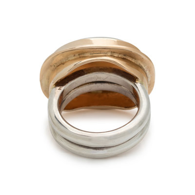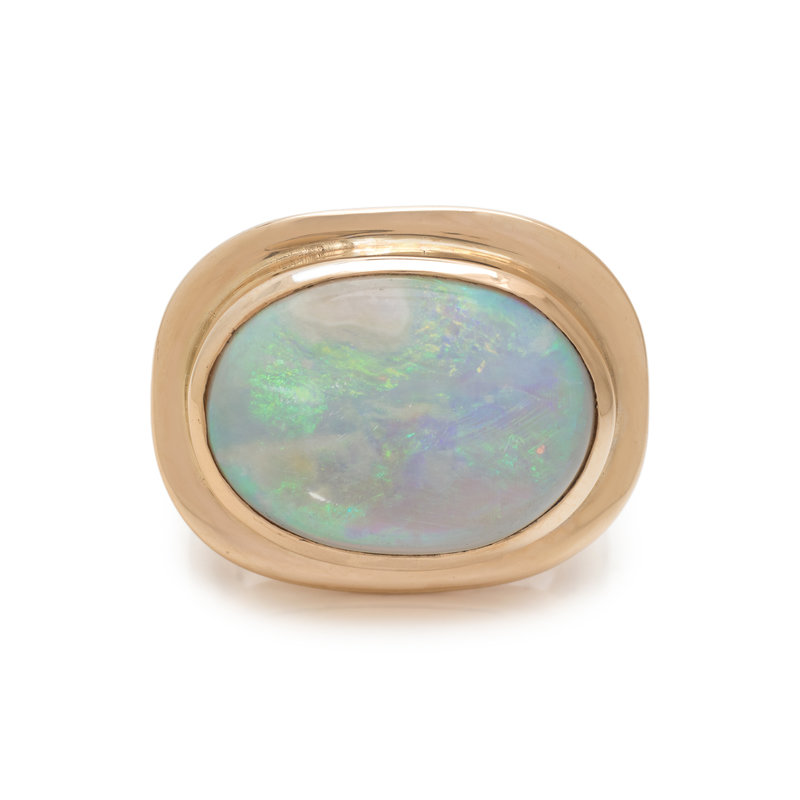 Containing one oval cabochon opal measuring approximately 13.75 x 18.75 mm. Mounted in yellow gold and silver. Ring size 6.