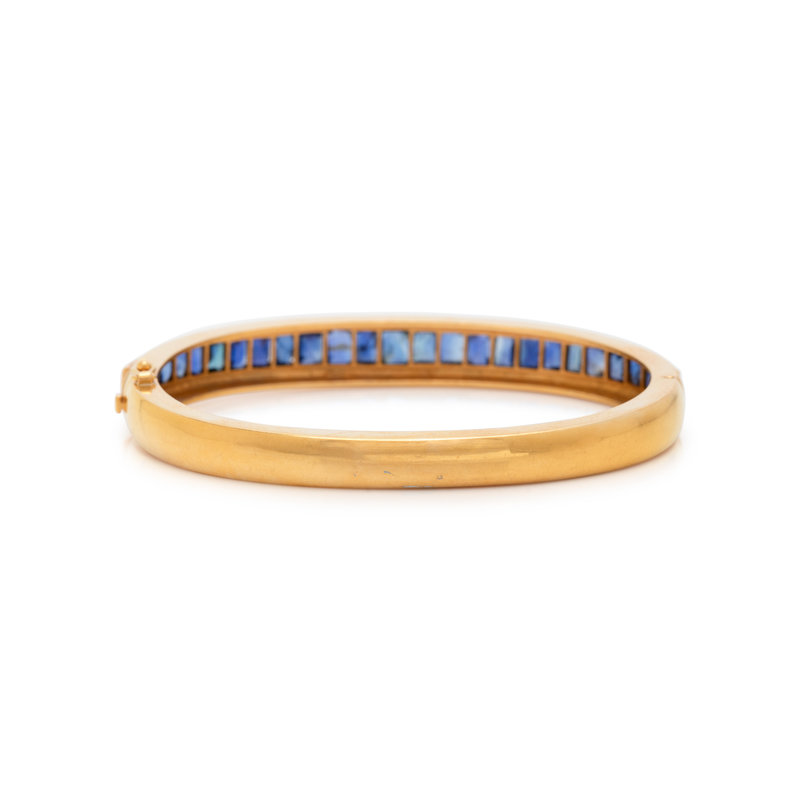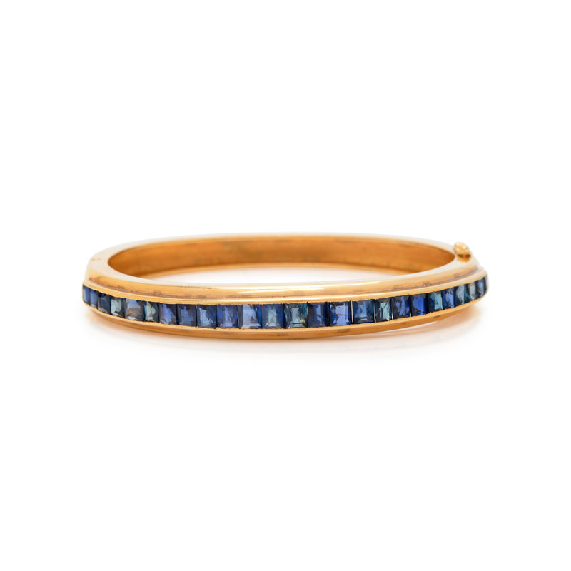 Containing 25 square step cut sapphires, hinged with side clasp. 6 inches inner circumference.