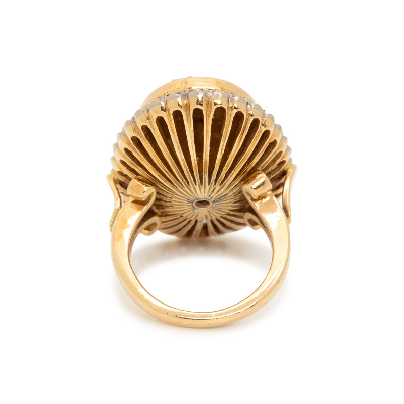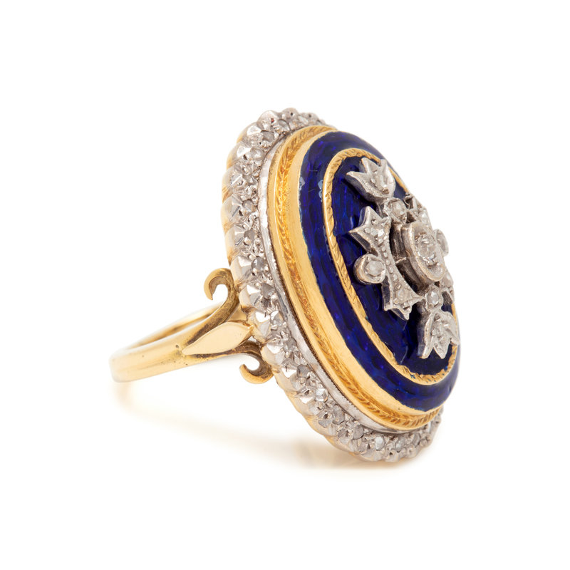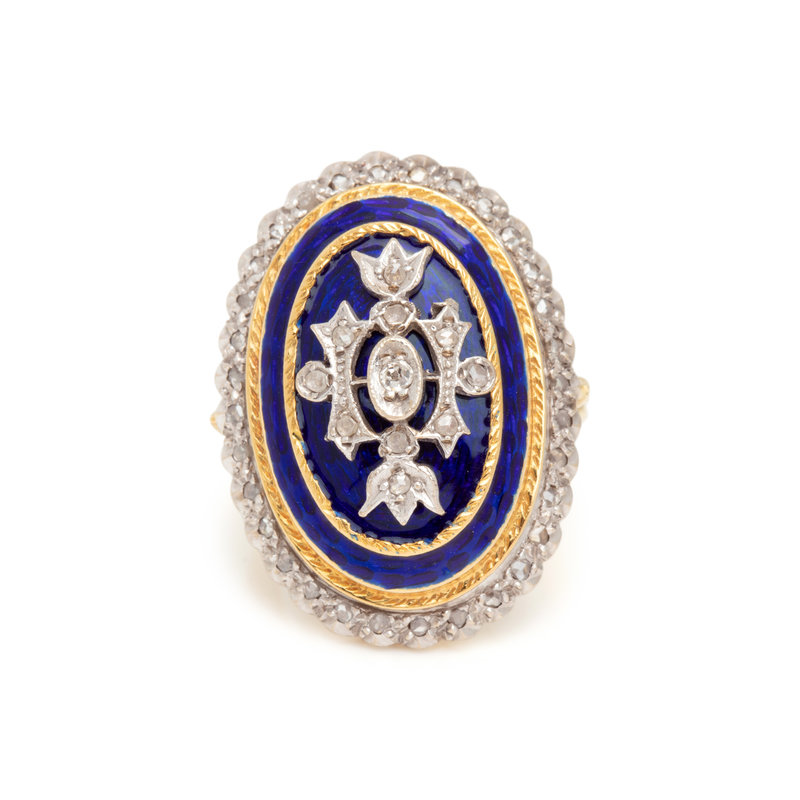 Containing numerous rose and old mine cut diamonds with blue enamel detail. Mounted in bicolor gold. Ring size 5 1/4.