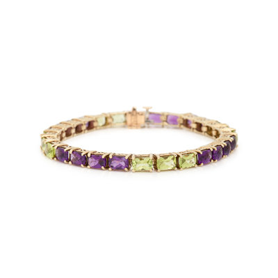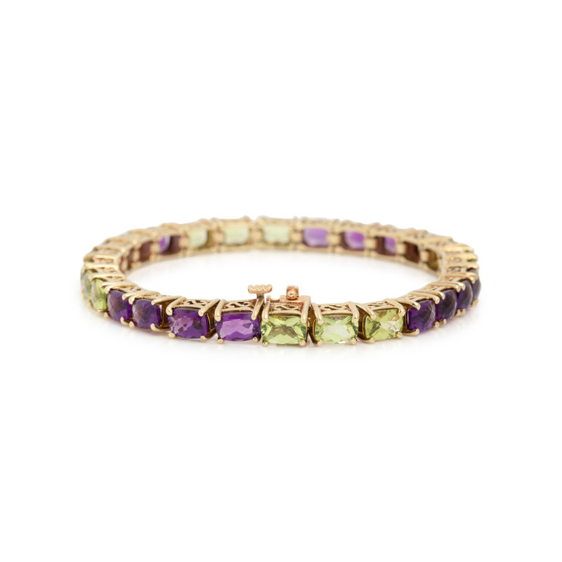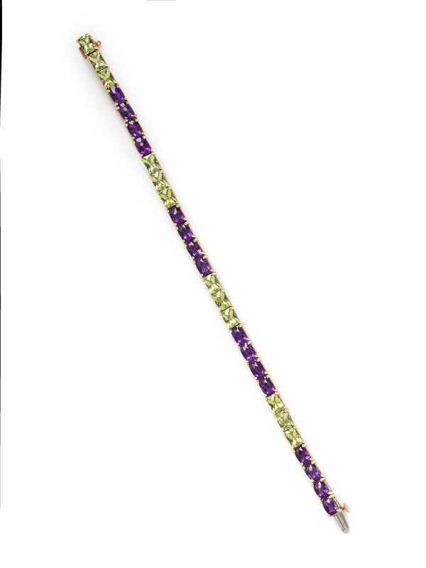 Containing 12 cushion checkerboard cut peridot and 16 cushion checkerboard cut amethysts. Mounted in yellow gold. 6 3/4 inches long.