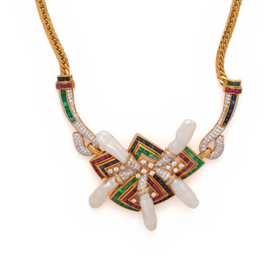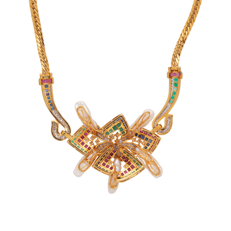 Containing five Baroque pearls, numerous calibre cut sapphires, rubies and emeralds and 230 round brilliant cut diamonds weighing approximately 3.00 carats total, suspended from a curb link chain. Mounted in yellow gold. 20 inches long.